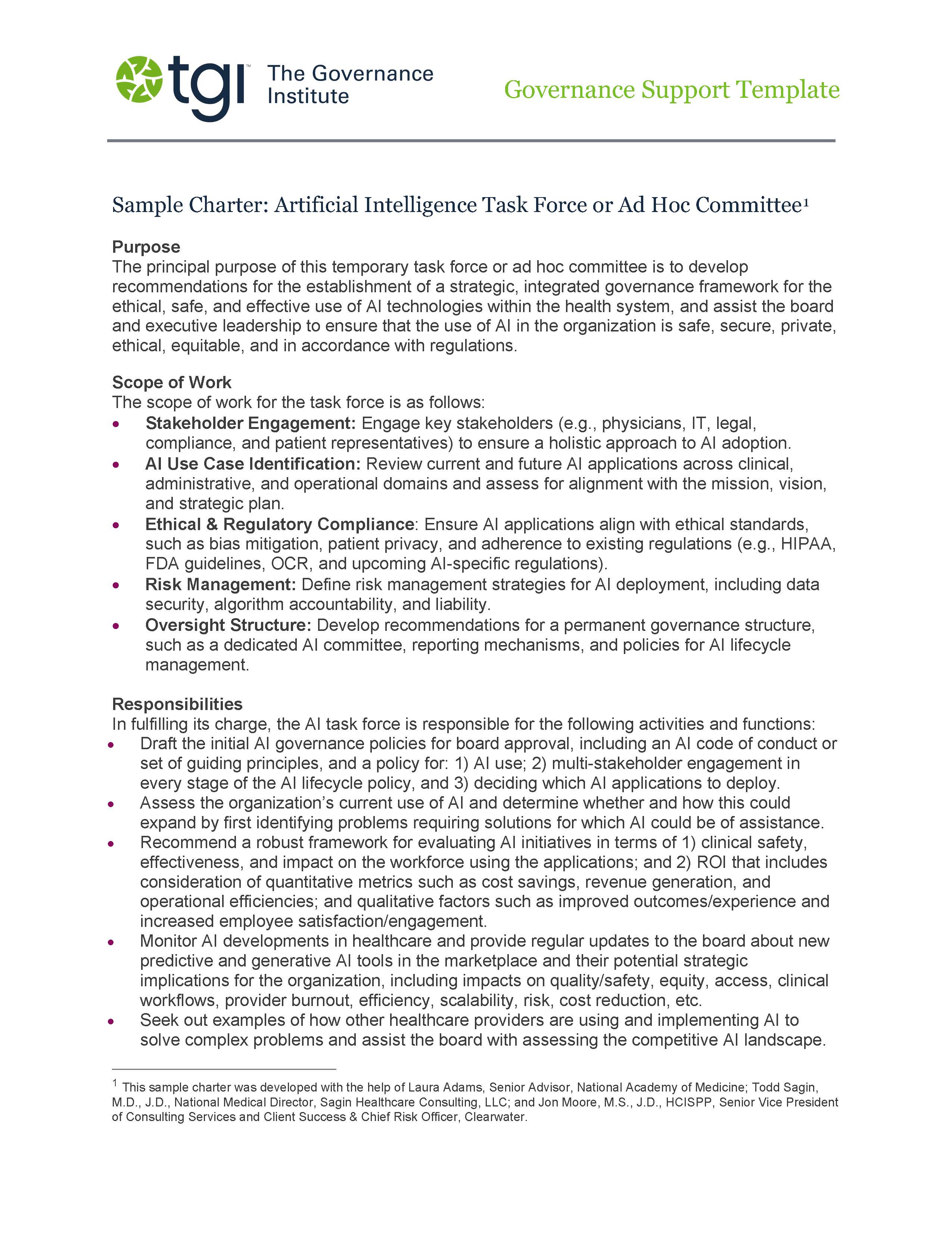 We want to hear from you! Share your organization’s AI success story to be featured in a case study or article, email kpeisert@governanceinstitute.com. June 2025 AI Guiding Principles for Non-Profit Healthcare Provider OrganizationsA sample list of guiding principles to serve as a baseline threshold that helps leadership determine which AI tools should be put forward for further consideration and implementation, and which should not. |